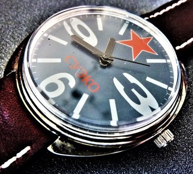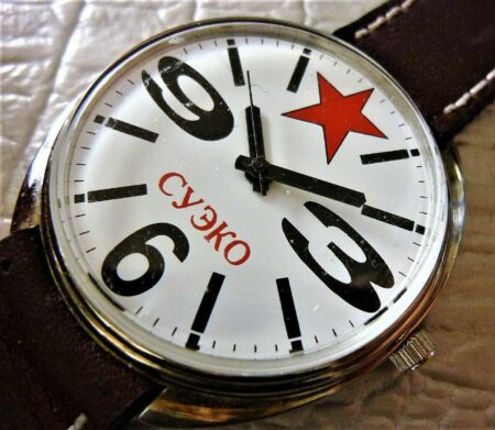 La marque « Суэко » est inconnue, et le mot ne veut rien dire en russe (cela semble un mémarquage en cyrillique approximatif de Seiko...). Le cadran s’inspire des Raketa « big zéro ».