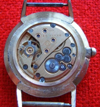 Marque: MontalUsine : Fabrique de Montres de MinskMécanisme: 2209 à 23 rubisBoîtier : Laiton plaqué or à fond clipséMécanisme : Luch 2209 à 23 rubis.Date de fabrication : Années ’70