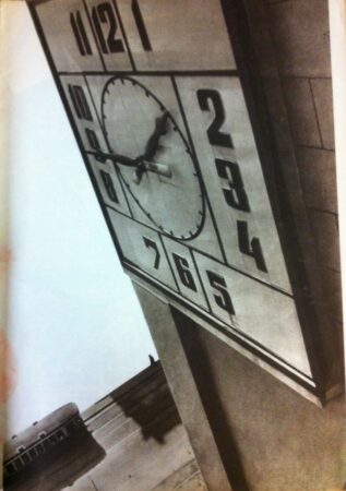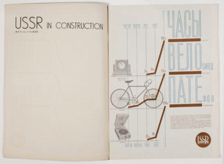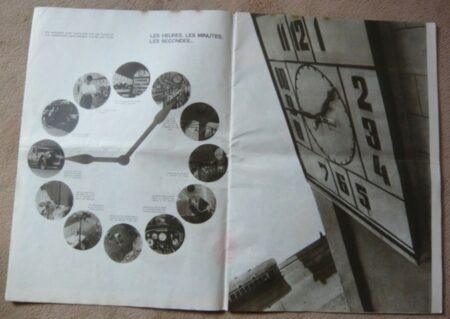 Page de gauche: « LES HEURES, LES MINUTES, LES SECONDES, une ronde des heures soviétiques », qui présente successivement: une horloge de gare de chemin de fer, une montre qui, dans un atelier, aide à mesure l’intensité du travail, une grande horloge murale pendue dans une fabrique, l’horloge du dispacher du métro de Moscou, la mesure du temps et de la distance dans une automobile, un chronomètre dans un stade, une horloge de rue, un docteur mesurant le poul d’un patient avec sa montre, une horloge de voiture de premiers secours, l’horloge de la brigade des pompiers, une horloge d’école.