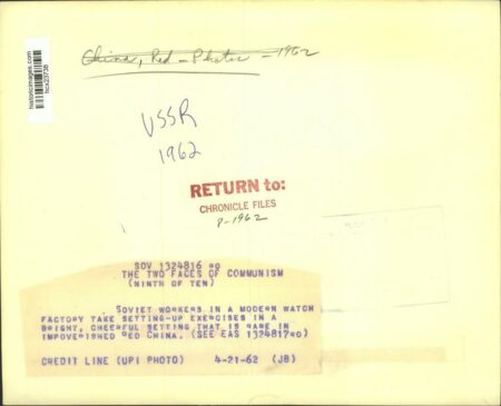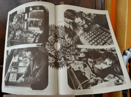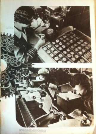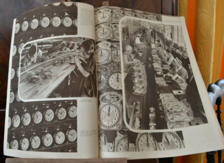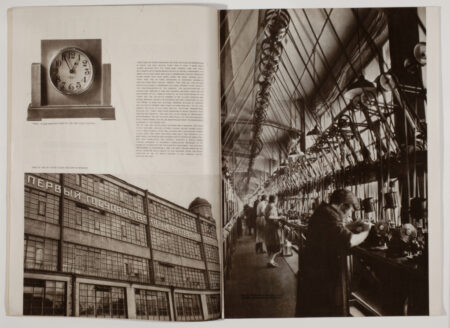 Texte: Les 1ère et 2e fabriques de montres (d’horloges) sont à Moscou. Elles fabriquent 170.000 montres, 3.600.000 horloge de cuisine, 440.000 réveils-matins, 75.000 pendules de table, 25.000 pendules murales et 1.500 horloges de rue électriques chaque année. Les deux fabriques n’ont été construites que récemment. En un court laps de temps, les ouvriers et ingénieurs ont eu à maîtriser une industrie absolument nouvelle, très compliquée et difficile. Une montre passe à travers des centaines de processus extrêmement compliqués au cours de sa fabrication. La plus petite imprécision, la plus petite négligence n’est pas admissible ici. La plus petite erreur sur la chaîne signifie la mort de la montre. Après la reconstruction de la 1ère fabrique de montres, il se produira 400.000 montres par an.