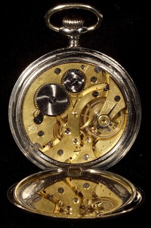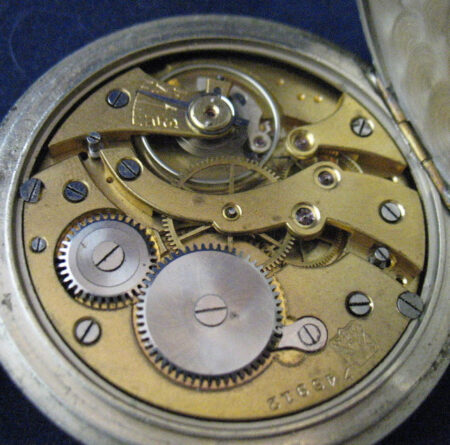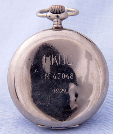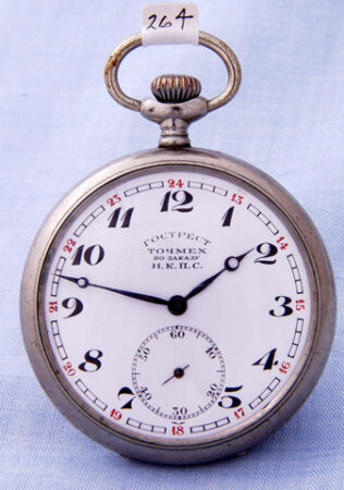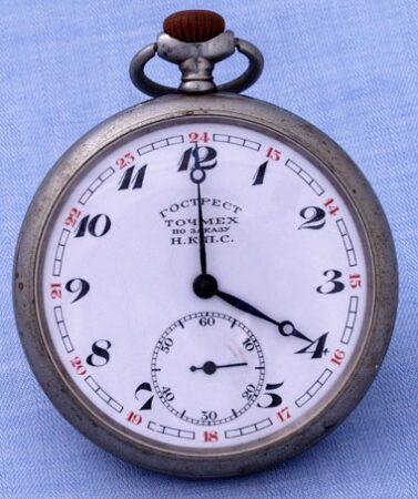 Montre de poche produite dans les années ’20 par le Gostrust Tochmekh. pour le NKPS (НКПС, Наро́дный комиссариа́т путе́й сообще́ния СССР), le Commissariat du Peuple aux Communications (qui avait notamment en charge les chemins de fer). Calibre: Moser. Aiguilles Breguet.
