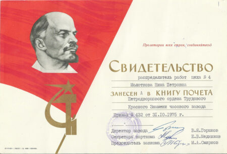 Ce certificat établit que la distributrice de travail de l’atelier n°4, Nina Petrovna Molotkova, figure dans le livre d’honneur de l’Ordre du Drapeau Rouge du Travail de la Fabrique de Montres de Petrodvorets. (en savoir plus sur ce document)