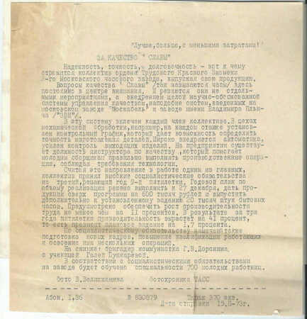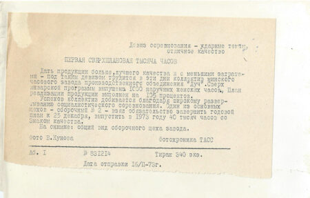Deux photos de l’Agence TASS de 1973, la première de la Fabrique de Montres de Minsk, la deuxième de la Deuxième Fabrique de Montres de Moscou.