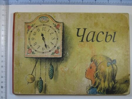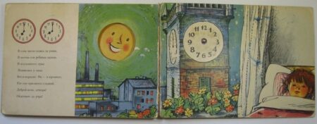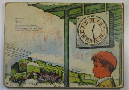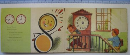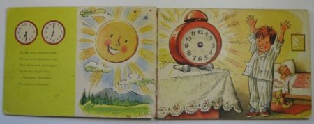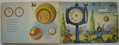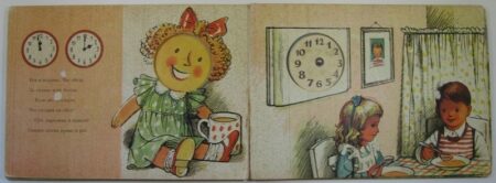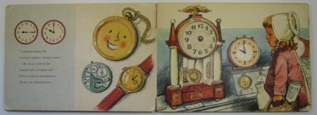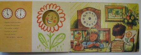 Un livre de 1964 pour apprendre aux enfants à lire l’heure.Dans cet exemplaire, il manque les aiguilles que les enfants devaient faire tourner sur la page de droite à l’exemple de la page de gauche.