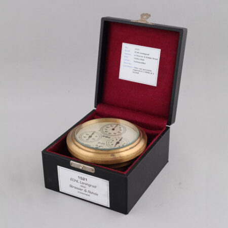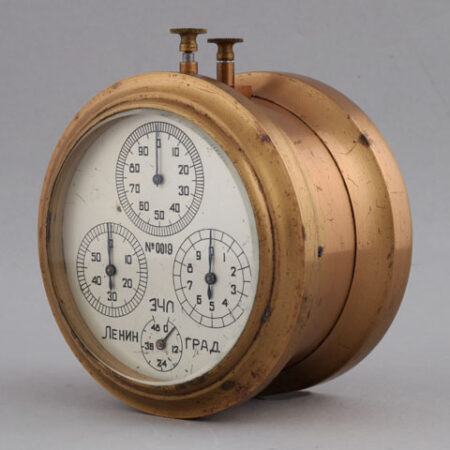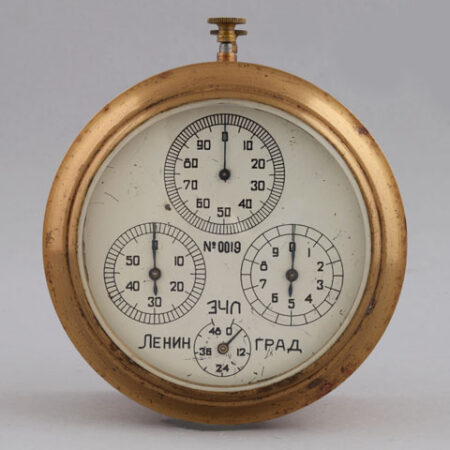 Cadran et éventuellement boîtier fabriqués en URSS par la Fabrique d’Horloges Électriques de Léningrad. Mouvement produit en Allemagne et apporté en URSS à titre de réparation peu après la Seconde Guerre mondiale.