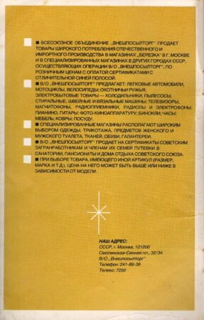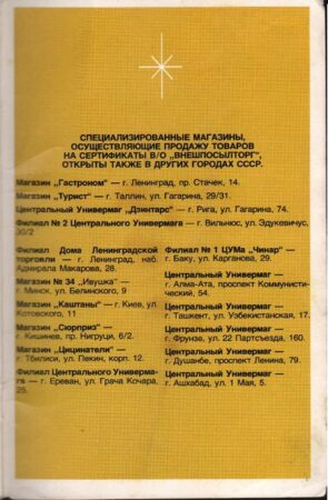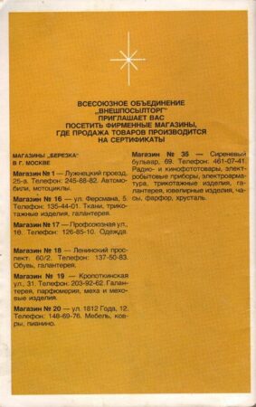 Le Vnechpolistorg gérait les magasins qui fournissaient les étrangers (et les Soviétiques travaillant à l’étranger) payant en devise ou en chèque émise par la Banque du Commerce Extérieur: voir ici.