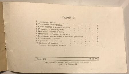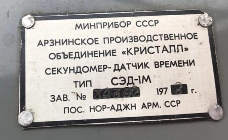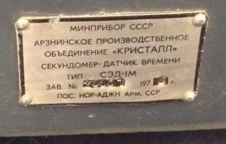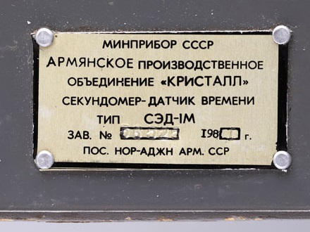 Cet exemplaire a été produit en 1981 par l’Association de Production arménienne « Cristal » (Армянское производственное объединение « кристалл »), qui dépendait Ministère de l’ingénierie des instruments, de l’automatisation et des systèmes de contrôle de l’URSS (Министерство приборостроения, средств автоматизации и систем управления СССР) en abrégé le Минприбор, le Minpribor.