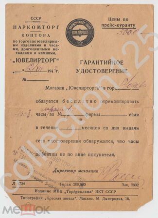 Un bon de garantie du Youvelirtorg pour une pendulette en marbre: