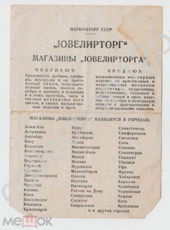 Au verso: la liste des magasins du Youvelirtorg en URSS: