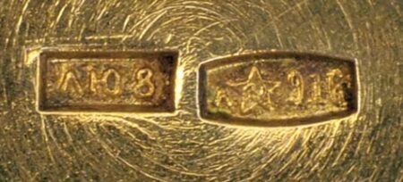 Ci-dessous: le poinçon (LYou8) de gauche indique la fabrique et l’année (par son dernier chiffre): Leningrad Youvelirtorg 1958. Le poinçon de gauche (916) la teneur en argent.