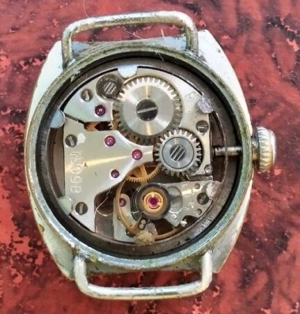 Mentions sur le calibre : 1509B sur un pont, logo Zaria (Lettres en éventail) sur un autre, n° de série (336331) sur la tranche