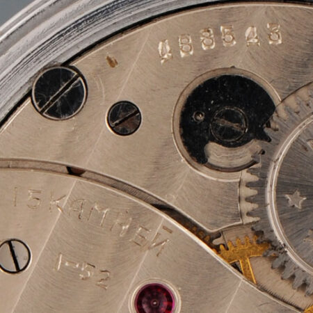 Elle emboite un calibre ЧК-6 produit le 1er trimestre 1952 par la Fabrique de Montres de Tchéliabinsk (n° de série 488543).