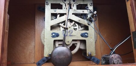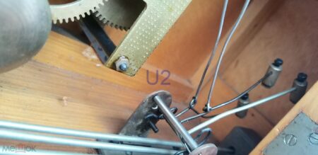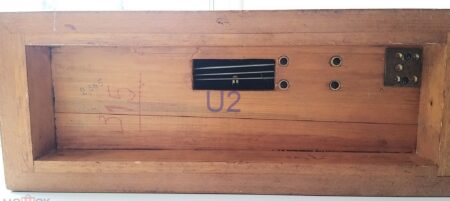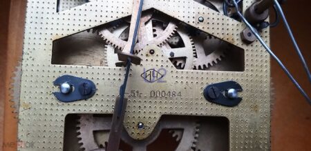 Horloge de cheminée produite le 2e trimestre 1955 par la 3e Fabrique de Montres de Moscou., mais à l’époque où elle s’appelait encore Fabrique pilote d’instruments du Chasprom, ce qui explique les initiales ИЧ du logo sur le mécanisme.