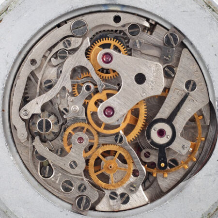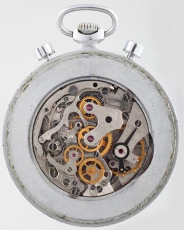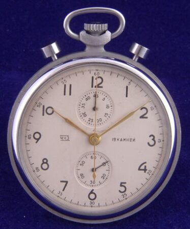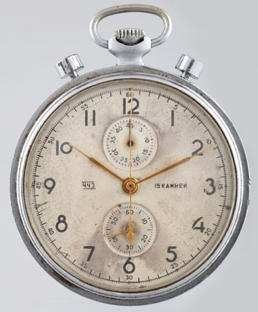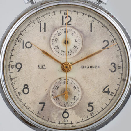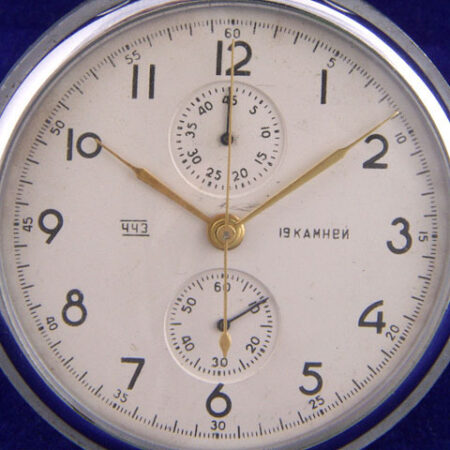 À la fin des années 1950, en réponse à la demande des secteurs scientifique, industriel et militaire, le gouvernement soviétique a acheté l’outillage et certaines pièces initiales du calibre chronographe suisse Venus 150 qui ont été utilisés pour créer le mouvement 3017, produit par la 1ère Fabrique de Montres de Moscou. Les deux versions, montre-bracelet et montre de poche, ont été produites. La version bracelet était la célèbre Strela. de la 1FMM. La montre de poche, plus rare, dont voici un exemplaire, était produite par la Fabrique de Montres de Tchéliabinsk