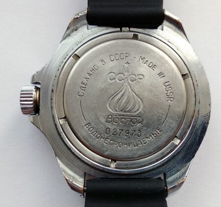 Fond frappé spécialement pour ces séries de montres fabriquées pour des importateurs italiens : clocher à bulbe avec CCCP et BOCTOK et n° de série (ici 027973), entouré des mentions suivantes disposées en cercle : водонепроницаemыe (étanche), cделано в cccp – made in USSR.