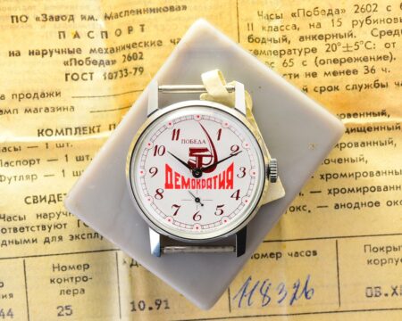Comme souvent avec les Pobeda ZIM de la fin des années ’80, le cadran a été utilisé avec les différents boîtiers de la fabrique: