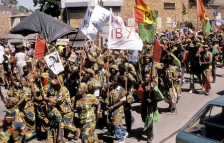 Ci-dessous, les deux drapeaux à une manifestation Interahamwe en 1991: