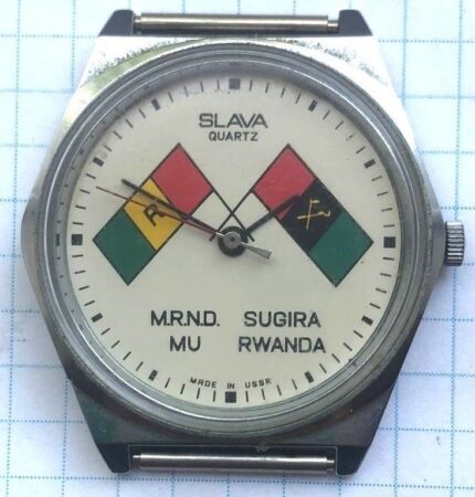 Le drapeau de droite sur la montre est celui mouvement de jeunesse du MRND, créé après 1973, chargé d’encadrer la jeunesse rwandaise, particulièrement lors des travaux d’intérêt collectif, d’où leur nom: Interahamwe (« ceux qui travaillent ensemble »). « Sugira » signifie « prospérité » en kinyarwanda.