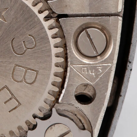 Mentions sur le calibre : 15 камней, 3-50 (pour 3e trimestre 1950) sur un pont, n° de série (11119) et logo de la fabrique de Penza (initiales ПЧЗ inscrites dans un triangle sur sa pointe) sur un autre, Звезда et trois étoiles sur le rochet.