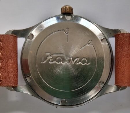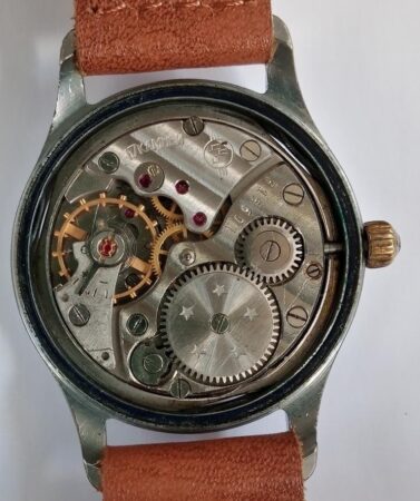 Mentions sur le calibre : n° de série (315601) sur un pont, premier logo de la fabrique de Tchistopol (initiales ччз dans une cercle flanqué part et d’autre de triple-traits) et 17 камня (17 rubis) sur un autre, cinq étoiles sur le rochet. Côtes de Genève.