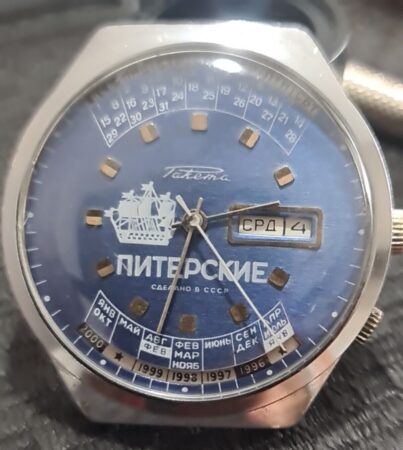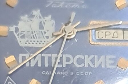 Le cadran est marqué питерские (« Piterskie ») qui signifie « de Piter », autrement dit « de Saint-Peterbourg », « Peter » étant le petit nom de la ville.
