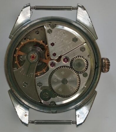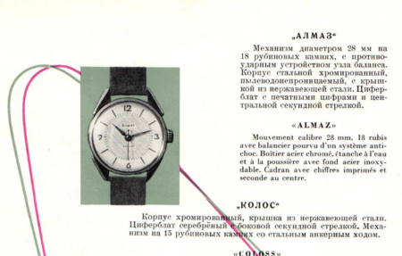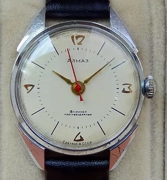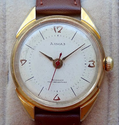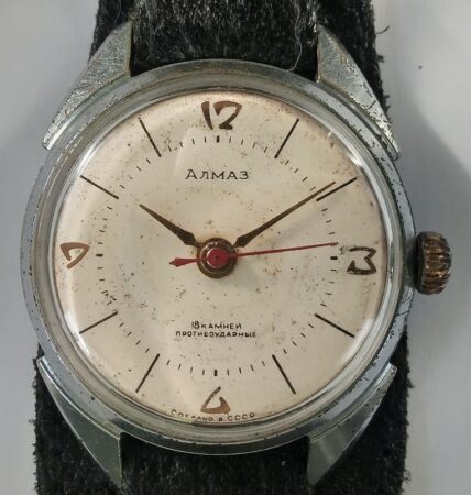 Gravure sur le fond : En cercle : противоударные (antichoc) пылевлагозащищенные (étanche à l’eau et à la poussière). Gravure à la main :Владимирy Васильевич (à Vladimir Vassilievitch) / Орёл (Orel : nom de la ville) / 29 X 1965 ; avec autour, en cercle, trois noms (peut-être des collègues de travail). Perlage à l’intérieur