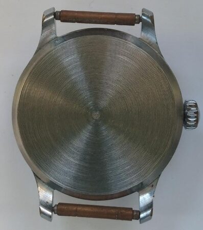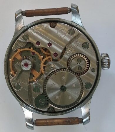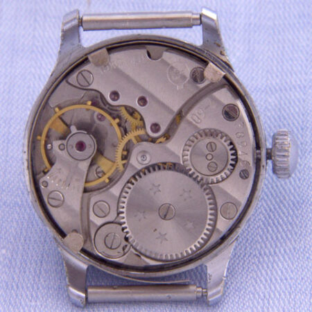 Mentions sur le calibre : n° de série (93113) sur un pont, ancien logo de l’usine (ЧЧЗ dans un cercle bordé de chaque fois trois traits) et 15 камней (15 rubis) sur un autre, cinq étoiles sur le rochet. Côtes de Genève.