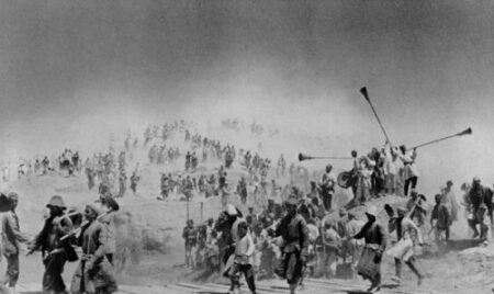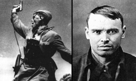 L’officier politique (« politruk ») Alexeï Yeremenko, emmène les soldats du 220e Régiment d’Infanterie à l’attaque en brandissant un pistolet Tokarev TT-33. Il sera tué quelques minutes après la prise de ce cliché le 12 juillet 1942, en Ukraine, dans la province de Voroshilovgrad, par le photographe Max Alpert, qui a intitulé la photo « kombat » (commandant de bataillon).