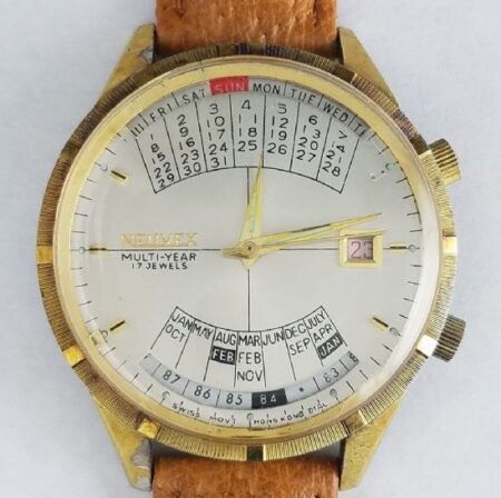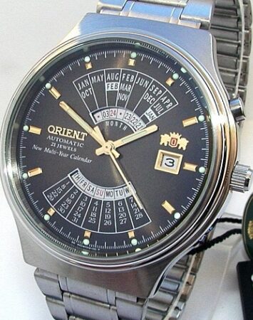 En 1965, la Orient sort le modèle « Multi Year Calendar ». Le concept était simple et astucieux : un disque imprimé avec les années (de 1960 à 1981 sur cette première version) et les jours de la semaine, était installé sur le mouvement (mais indépendante de lui). Une seconde couronne permettait de faire tourner le disque et lorsque l’année était placée sous le mois correspondant en bas du cadran, les jours de la semaine apparaissaient « comme par magie » juste au-dessus de la date correspondante en haut du cadran. Les années en rouge indiquaient les bissextiles: