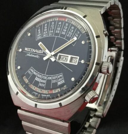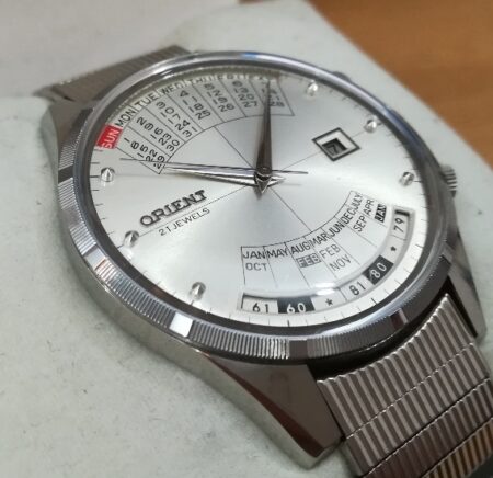 Ce concept est rapidement devenu populaire et est devenu l’un des designs les plus reconnaissables d’Orient. Les disques ajoutés signifiaient également que la montre devait être plus grande que la plupart des montres des années 60 ; avec un diamètre d’environ 39 mm. Au fil des ans, le calendrier pluriannuel a évolué. Orient a ajouté la fonction de calendrier annuel à sa nouvelle ligne de mouvements automatiques dotés d’un poussoir de mise à l’heure rapide de la date à 2 heures, et la couronne de rotation de la roue des années a donc dû être déplacée vers le bas à 4 heures. Orient a commercialisé ses modèles aux USA sous la marque Wittnauer: