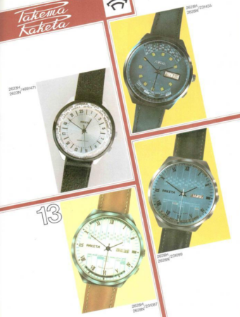 A la grande crise de Raketa, ce modèle étant un des derniers a avoir du succès (la clientèle de l’export et des touristes faisant l’appoint), il a été décliné de manière parfois douteuse (en la faisant passer pour une montre de la marine de guerre par exemple…). Les franken ne sont pas rares, parfois avec sur-impression d’un motif sur un cadran original (le tête de Staline par exemple…).