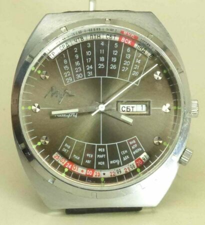 Juste après la fin de l’URSS la Fabrique de Montres de Minsk a produit des montres à calendrier perpétuel emboitant un mécanisme à quartz 2350 à 7 rubis: