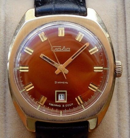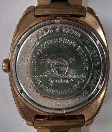 Gravure sur le fond : противоударные бaлaнз (mouvement antichoc) пылевлагозащищенные (étanche à l’eau et à la poussière) et la marque de qualité de l’URSS.