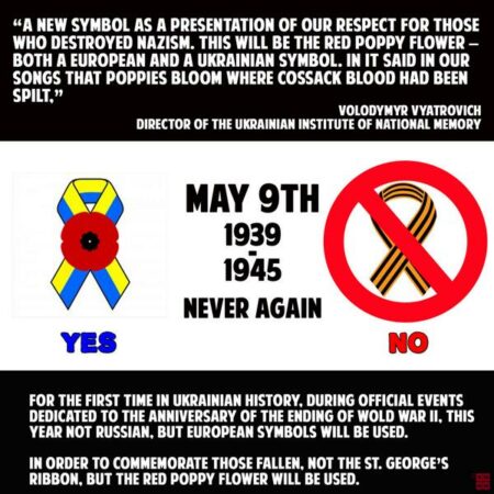 Ci-dessous: Le symbole que les autorités ukrainiennes veulent substituer au ruban de Saint-Gorges pour célébrer le 9 mai 1945: