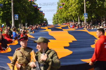 Les habitants pro-russes de Mariopol déployant un grand ruban de Saint-Georges: