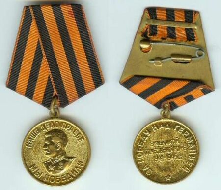 Sur l’avers de celle-ci se trouve Staline en tenue de maréchal. Sur le pourtour en haut: Notre cause est juste (Наше дело правое), en bas Nous avons vaincu (Мы победили). Au verso, sur le pourtour: Pour la victoire sur l’Allemagne (За победу над Германией) et au centre: dans la Grande Guerre patriotique de 1941-1945 (в Великой Отечественной войне 1941—1945 гг.).