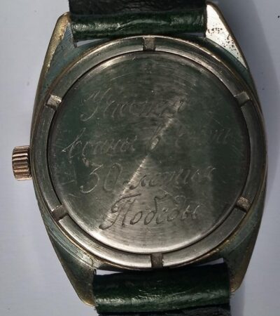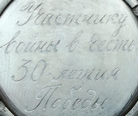 Gravure sur le fond : (à la main) « Pour un participant à la guerre. En commémoration des 30 ans de la victoire. » Perlage à l’intérieur