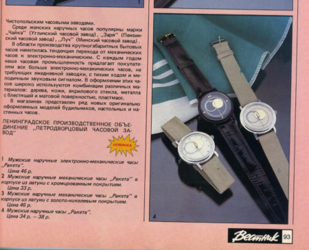 La Copernic se décline en plusieurs modèles (cadran noir, blanc ou argenté, index chiffré ou de carrés ou de pastilles dorés, etc.). Ici dans вестник (le Bulletin du commerce et de l’industrie de l’hiver, le catalogue des biens de consommation) de l’hiver 1989/1990: