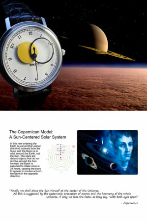 La montre originale symbolisait l’héliocentrisme, mais la symbolique des aiguilles connaît deux versions (la notice du catalogue ne permet pas de trancher). Selon la première, l’aiguille des minutes représente la terre qui tourne autour du soleil (aiguille des heures) ; selon la seconde, l’aiguille des minutes représente la lune – ce qui permet de représenter les éclipses.