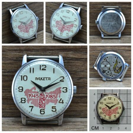 Motif sur le cadran : Carte de l’URSS en hachuré rouge, mention « 1945 1985 » flanquant un dessin représentant le mémorial du soldat soviétique de Trepkow.. cделано в cccp à six heures