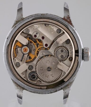 Mentions sur le calibre : n° de série (46689) sur un pont et 4-58 (millésime) sur un pont, premier logo de la fabrique de Tchistopol (initiales ччз dans une cercle flanqué part et d’autre de triple-traits) et 17 камня (17 rubis) sur un autre. Côtes de Genève. Ce calibre a été réparé parce qu’il a un rochet de la 1ère Fabrique de Montres de Moscou.