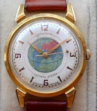 Sur le cadran figure un planisphère sur laquelle l’URSS est en rouge (devenu rose avec le temps…). La trotteuse a un petite disque rouge figurant le Spoutnik et tournant autour du globe. L’index est composé de petites fusées dorées.