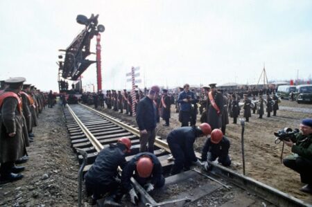 C’est le 1er octobre 1984, à la gare de Kuanda dans la région de Tchita, qu’a eu lieu la cérémonie solennelle de pose du « lien d’or ». Les équipes qui posaient les rails de l’ouest et de l’est du pays se sont rencontrées.