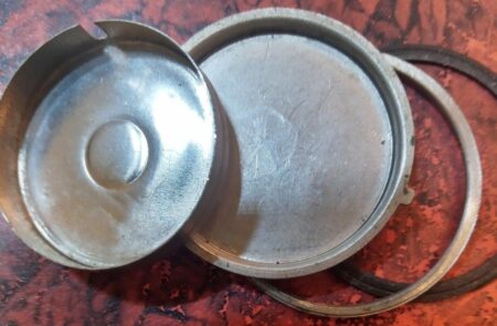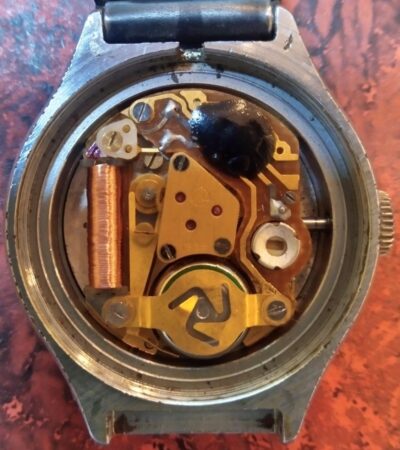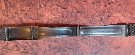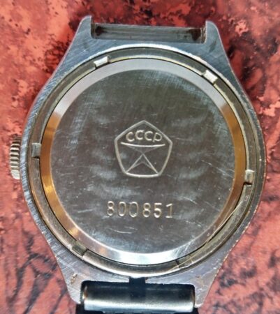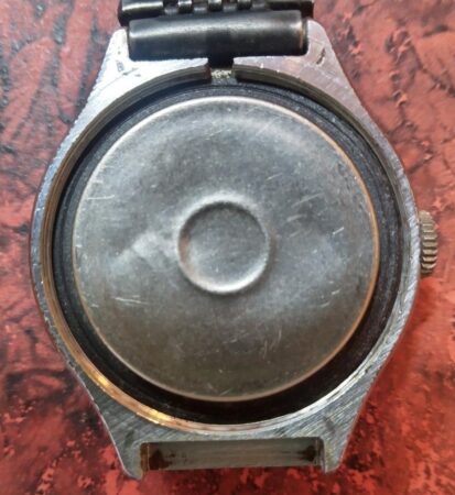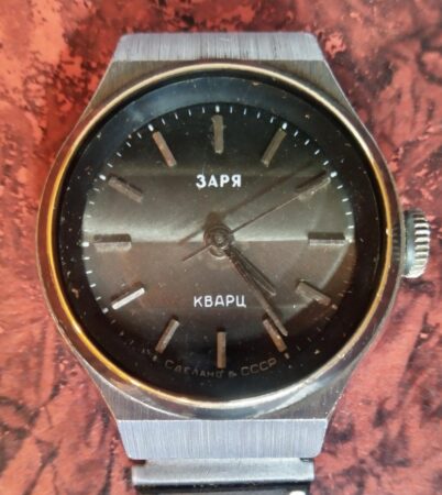 Bracelet métallique d’origine d’acier noirci marqué du logo « Zaria » et de la mention нерж сталь (acier inox) à l’intérieur