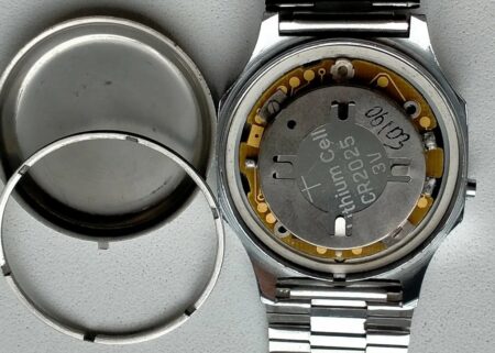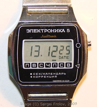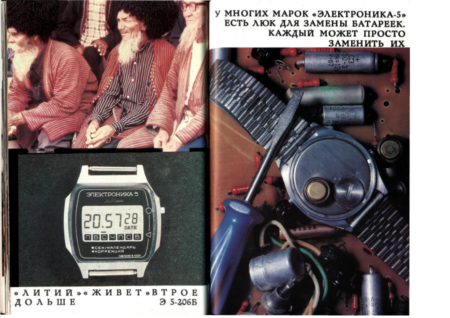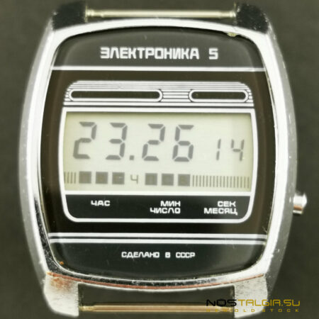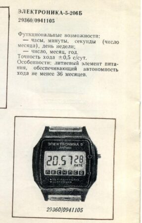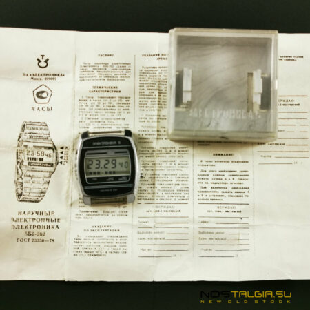 Le prototype était une montre Casio avec le même ensemble de fonctions. Le seul modèle de montre Elektronika avec une pile au lithium. Après avoir remplacé la pile (pile CR2025), il faut appuyer simultanément sur deux contacts pour mettre la montre en marche.