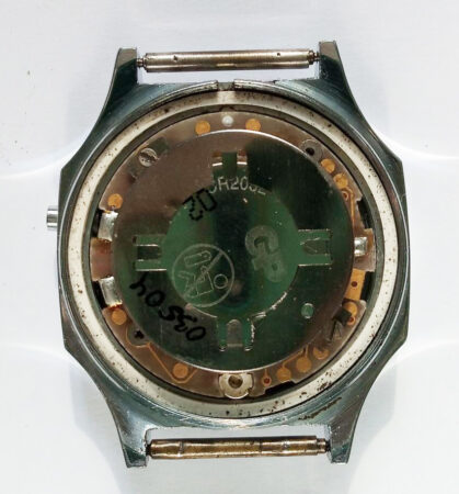 Le prototype était une montre Casio avec le même ensemble de fonctions. Le seul modèle de montre Elektronika avec une pile au lithium. Après avoir remplacé la pile (pile CR2025), il faut appuyer simultanément sur deux contacts pour mettre la montre en marche.
