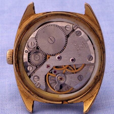 Mentions sur le calibre : 2623.H et logo raketa (raquette symbolisée) sur le pont, n° de série (24488) sur la platine.