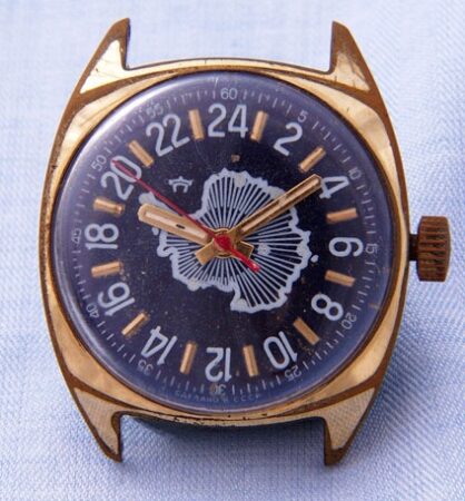 Remarque : Il existe trois modèles de cadran : le premier avec la mention Советская антарктическая экспедиция qui empiète sur la carte de l’Antarctique et avec six points rouges symbolisant les bases (voir ici), le deuxième avec la mention qui n’empiète pas et avec sept points rouges (la station Russkaya s’étant ajoutées aux six autres) (voir ici), et une troisième avec sept points blancs à l’endroit des bases – sans compter les fakes et les « hommages ». Le premier type a été produit de 71 à 80, le second de 1980 à 1985. Cet exemplaire a le cadran troisième type.