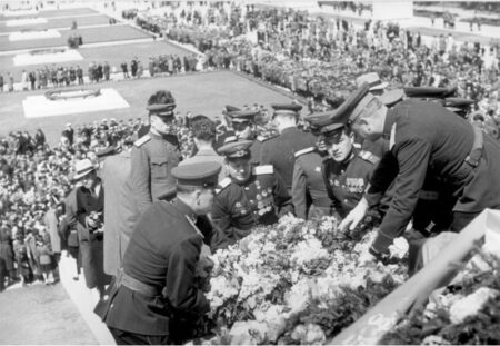 Le cimetière commence à cet endroit. Il s’étend derrière deux gigantesques drapeaux abaissés, en granit rouge, gardés par des soldats agenouillés. Celui de gauche est âgé, celui de droite est plus jeune. En grand apparat et armés, ils rendent hommage à leurs camarades et gardent leurs tombes.