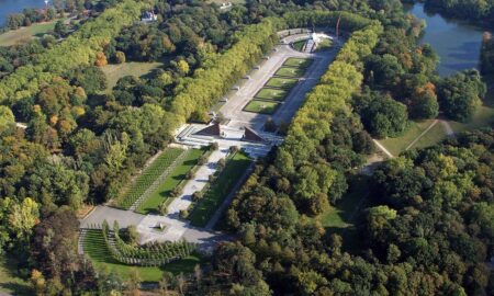 Au bout de l’axe se dresse la statue en bronze d’un soldat de l’Armée rouge du sculpteur Evgueni Voutchetitch qui porte un enfant sur un bras, pointe le sol de son épée et foule de son pied une croix gammée brisée. L’enfant symbolise le peuple innocent qui peut espérer un avenir meilleur dans les bras du sauveteur. Sous la statue se trouve une coupole accessible où une mosaïque est visible.